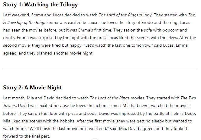 Last weekend, Emma and Lucas decided to watch The Lord of the Rings trilogy. They started with The Fellowship of the Ring. Emma was excited because she loves the story of Frodo and the ring. Lucas had seen the movies before, but it was Emma’s first time. They sat on the sofa with popcorn and drinks. Emma was surprised by the fight with the orcs. Lucas liked the scenes with the elves. After the second movie, they were tired but happy. “Let’s watch the last one tomorrow,” said Lucas. Emma agreed, and they planned another movie night.