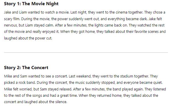 Our starting point could be: “Write two short stories about two friends, each approximately 100 words long, at an Elementary level of English. Make sure the stories contain 5 subtle differences between them.” Here’s what ChatGPT generated: