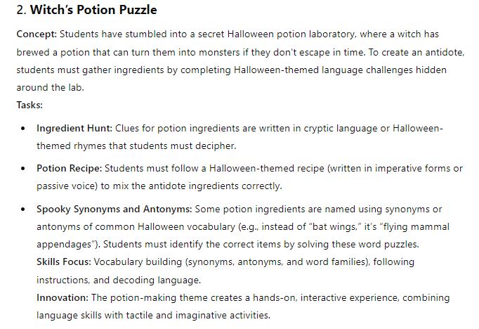 Concept: Students have stumbled into a secret Halloween potion laboratory, where a witch has brewed a potion that can turn them into monsters if they don’t escape in time. To create an antidote, students must gather ingredients by completing Halloween-themed language challenges hidden around the lab.