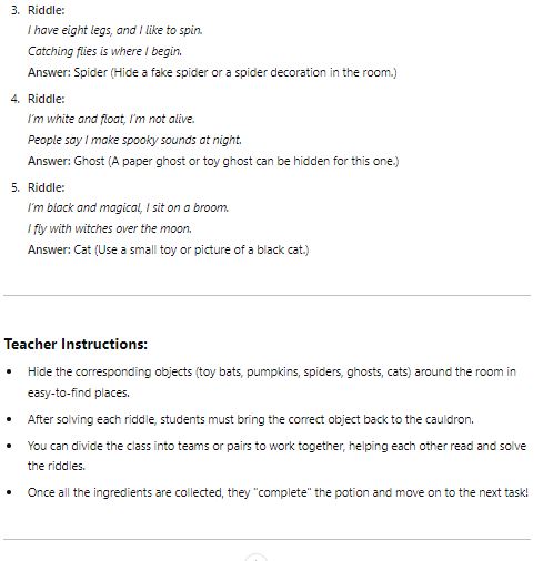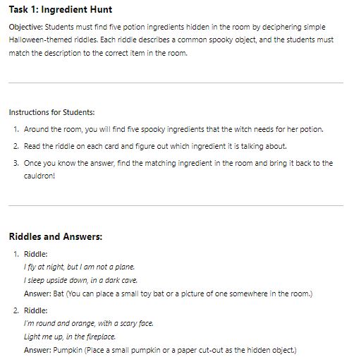 - Ingredient Hunt: Clues for potion ingredients are written in cryptic language or Halloween-themed rhymes that students must decipher.
