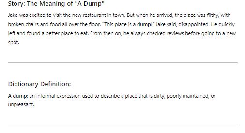 How does this translate to a Gen.AI-assisted teacher in class? Well, we could just type explain the meaning of “a dump” into ChatGPT for our students to see on the board in front. We could also ask to generate a few example sentences.