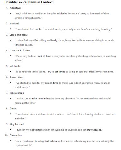 Let’s delve into it a bit more. I can now ask ChatGPT to generate useful vocabulary for possible answers, as in: Can you suggest useful lexical items in context for possible answers for question number 8?