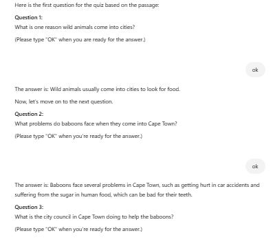 Here’s the prompt: Create a quiz based on the reading passage that I will be copying and pasting for my Intermediate students of English who have just finished reading. Design a 10-question quiz, starting with three easy questions and gradually increasing in difficulty. Present the questions one at a time. When I type “OK”, provide the answer. Continue this process for all 10 questions.