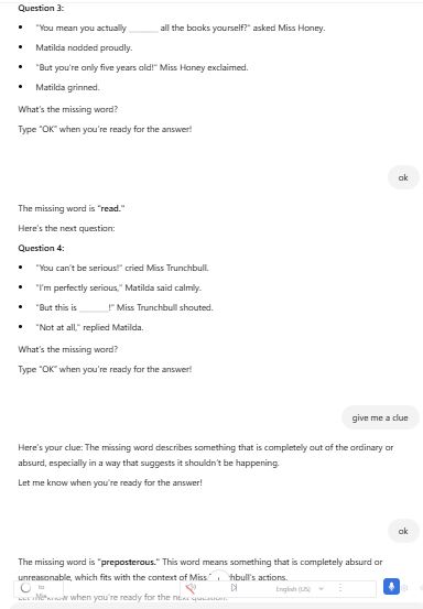 This is the prompt: Create a game called “Guess the word” based on Roald Dahl’s novel Matilda for my Intermediate students of English who have just finished reading the graded reader version. Design a 10-question quiz starting with three easy questions and gradually increasing in difficulty. The questions should consist of two to four line conversational exchanges from the novel, separated by bullets, and the students have to guess the missing word. Use dotted lines for the missing word. Present the questions one at a time. When I type “OK”, provide the answer. Continue this process for all 10 questions. If I type “give me a clue” before typing “OK, you must give me a clue that will help me guess the missing word.