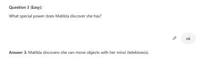 This is a possible prompt: Create a quiz based on Roald Dahl’s novel Matilda for my Intermediate students of English, who have just finished reading the graded reader version. Design a 10-question quiz, starting with three easy questions and gradually increasing the difficulty level. Present the questions one at a time. When I type “OK”, provide the answer. Continue this process for all 10 questions.