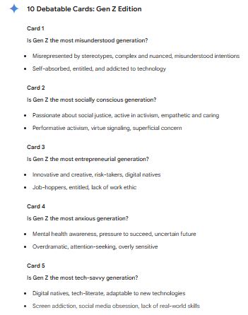 Of course, we could narrow down the creation of debate questions to one specific topic in alignment with the current coursebook material or topics we are currently discussing in class. Prompt: Based on these instructions again, generate ten new cards, but this time all debate questions must be centered around this topic: Gen Z.