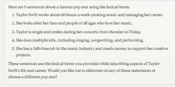 – Now generate 5 sentences that are true of a famous pop star using any of the items