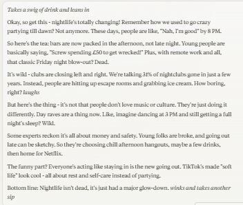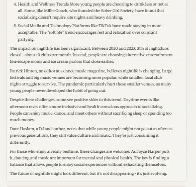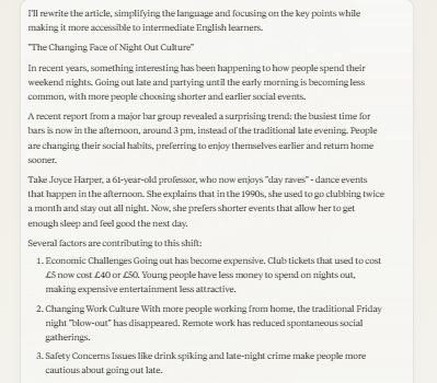 “Here’s a newspaper article entitled “By 8pm it is time to head home: whatever happened to the big night out?” I am copying and pasting this article, and I want you to rewrite a shortened version, reducing it to around 700 words. The rewritten article must keep the ideas from the original. Simplify the advanced language and shorten long sentences to make it easy to follow. The new version should be clear and share the main points of the original text so that a student of English at a lower-intermediate level can understand it. Here’s the original article: [pasted article].
