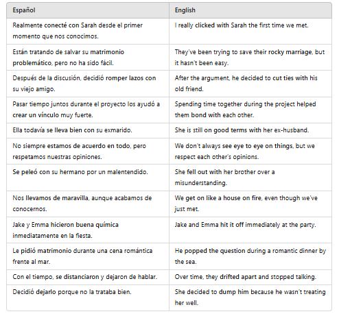 All we have to do is give ChatGPT (or similar Gen.AI) the following prompt: Create a table with example sentences using the following lexical items related to relationships. On the right side, include the sentences in English. On the left side, provide their Spanish translations. Please use bold letters to highlight the focal vocabulary in both English and Spanish. I am an Upper-Intermediate student of English so the sentences should clearly exemplify the meaning of each lexical item. These are the lexical items (list of items above).