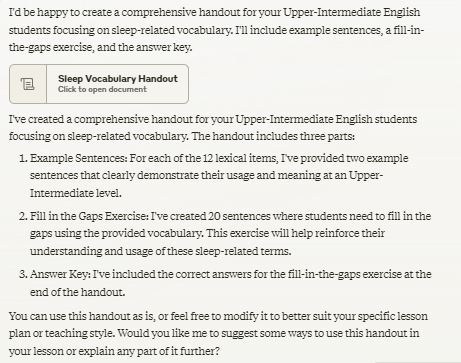 Now I can open the document and copy or download it. I find it more practical to just copy and paste into a Word document that can be emailed, uploaded to a learning platform, or (my favourite option) pasted into a Google Doc that students have already access to. This way, there’s nothing else to do after copying and pasting. If you have already typed and saved the prompt in the Gen.AI tool, all there is to do is retrieve it, copy and paste it, and replace the target expressions as needed.
