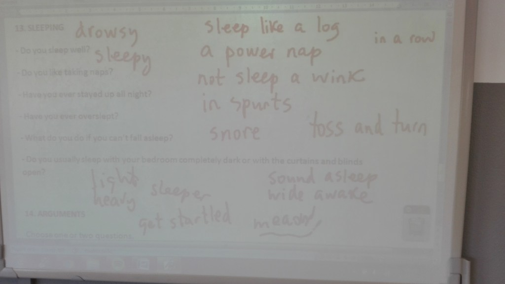 Let’s take a look at some board annotations from an Upper-Intermediate class. Students were discussing the topic of sleep, first in small groups and then in plenary mode. While they were working in small groups, I was eavesdropping, assisting them with language, and writing my reformulations and suggestions on the board. Before the whole-class speaking session, we reviewed most of these words and their meanings, and explored how they could be used in connection with what the students had been trying to express earlier. I will now select a few lexical items relevant to the topic that I find useful for students to know, add to their mental lexicon and use. These items will also be added to my class notebook to design activities aligned with them.