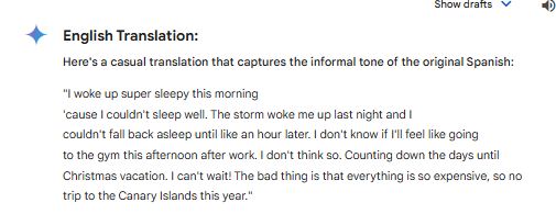 Here is the idea: students could reflect on their plans for the day, daily activities, accomplishments, goals, aspirations, or anything else that comes to mind. They would use a Gen.AI tool to write down their thoughts for the day in their L1. Next, they would ask the tool to translate the resulting text into their target language (L2).