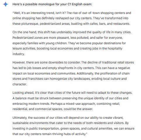 Prompt: I am a C1 (Advanced) English student studying English at a Escuela Oficial de Idiomas in Spain. Please create an example monologue for the speaking test with this task from the exam paper: “As out-of-town shopping centres and online shopping proliferate, our city centres are becoming picturesque pedestrianised areas of cafes, bars and restaurants. Talk about the repercussions for city life and for the cities of the future.” Act as if you were me taking the exam. Please include linkers, grammar and vocabulary typically found in ELT coursebooks at that language level so that I can ace the exam. Please make sure it sounds natural. The generated text should take about 3 minutes to read.