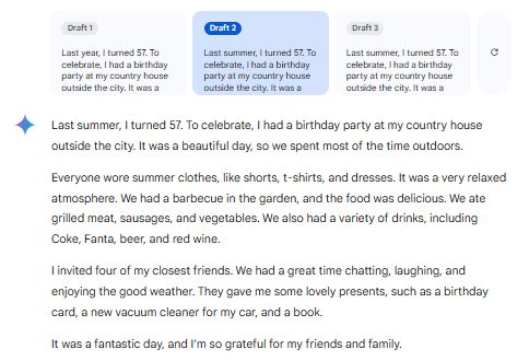 Gemini generated three drafts for me, and I am choosing number 2. We can clearly see that this longer text now is far beyond the targeted language level. Learners can, however, disregard things they don’t understand or that are difficult to memorize and retrieve. There is, nevertheless, very good learning material here that can feasibly be adopted at that language level: ‘I turned 57’, ‘outside the city’, ‘we spent most of the time outdoors’, ‘a relaxed atmosphere’, ‘we had a barbecue’, ‘grilled meat’, ‘a variety of drinks’, ‘four of my closest friends’.