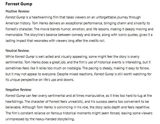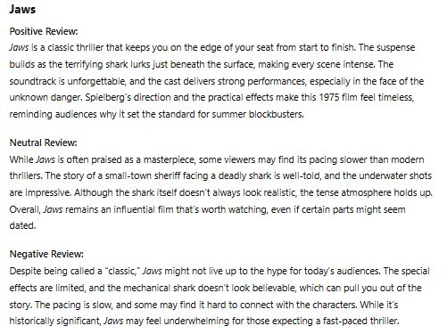 First of all, we are going to ask ChatGPT to write movie reviews for us. Given the nature of the subject matter, this lesson works better for Intermediate levels and above, though it can be adapted for lower levels. Here’s a possible prompt: Write one positive, one neutral and one negative review of about 80 words each for each of the following movies: Jaws, Forrest Gump and The Wild Robot. The reviews should address aspects such as the plot, themes, acting and characters, cinematography, or special effects. The target reader is an upper-intermediate student of English. Include vocabulary, collocations and language chunks to talk about movies that are useful for language learners at this level.