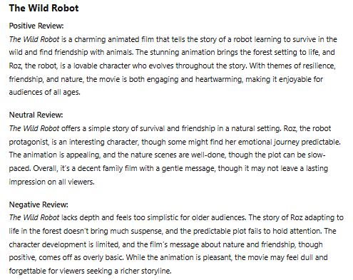 The Wild Robot is a charming animated film that tells the story of a robot learning to survive in the wild and find friendship with animals. The stunning animation brings the forest setting to life, and Roz, the robot, is a lovable character who evolves throughout the story. With themes of resilience, friendship, and nature, the movie is both engaging and heartwarming, making it enjoyable for audiences of all ages.Neutral Review: